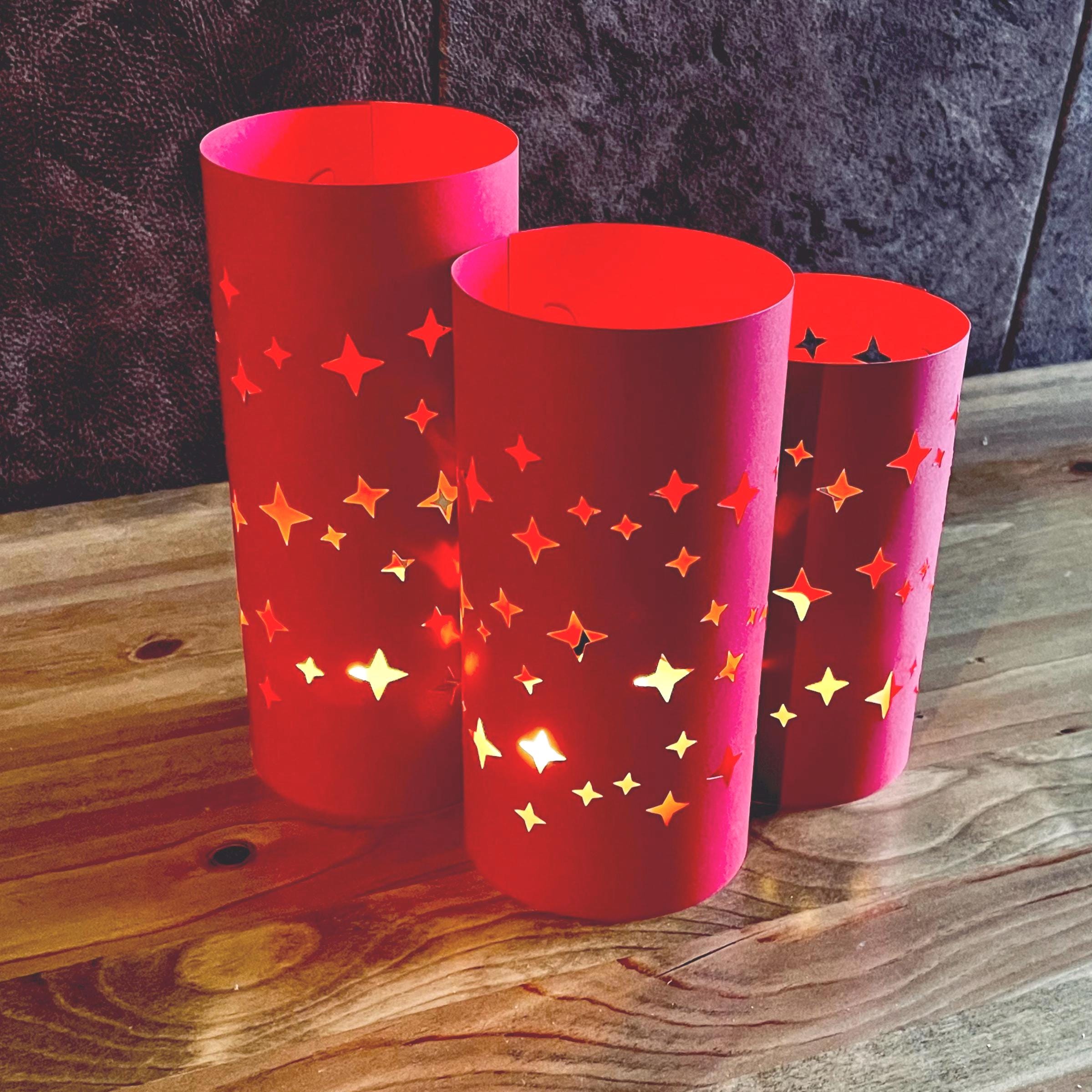 STAR LUMINARY TRIO Centerpiece (set of 3 Luminaries) is made from 80lb Card Stock to use with battery candles (not included). Fast & Easy Party Decor is perfect for Destination Weddings! Each trio of LUMINARIES make a beautiful and affordable centerpiece. Super EASY to transport and assemble - no tape or adhesive required, the tabs lock together for a secure sturdy assembly. Reusable!
