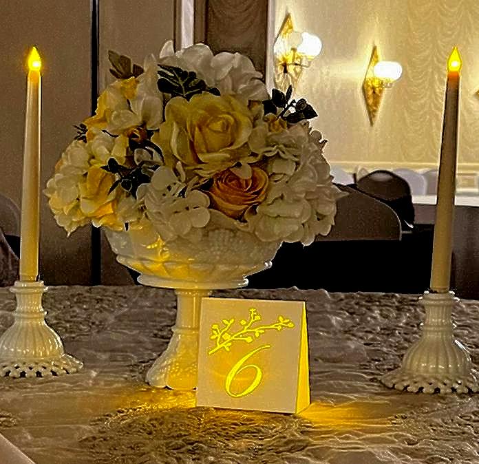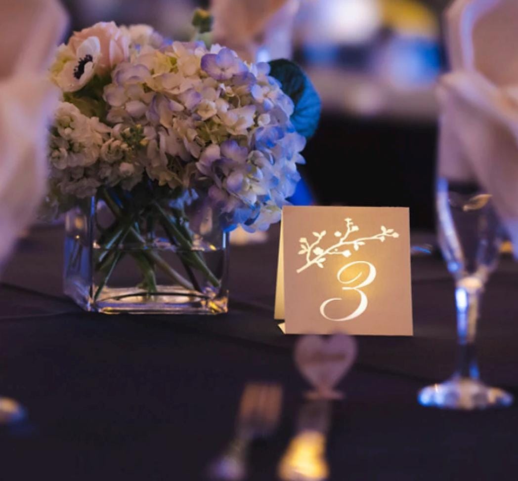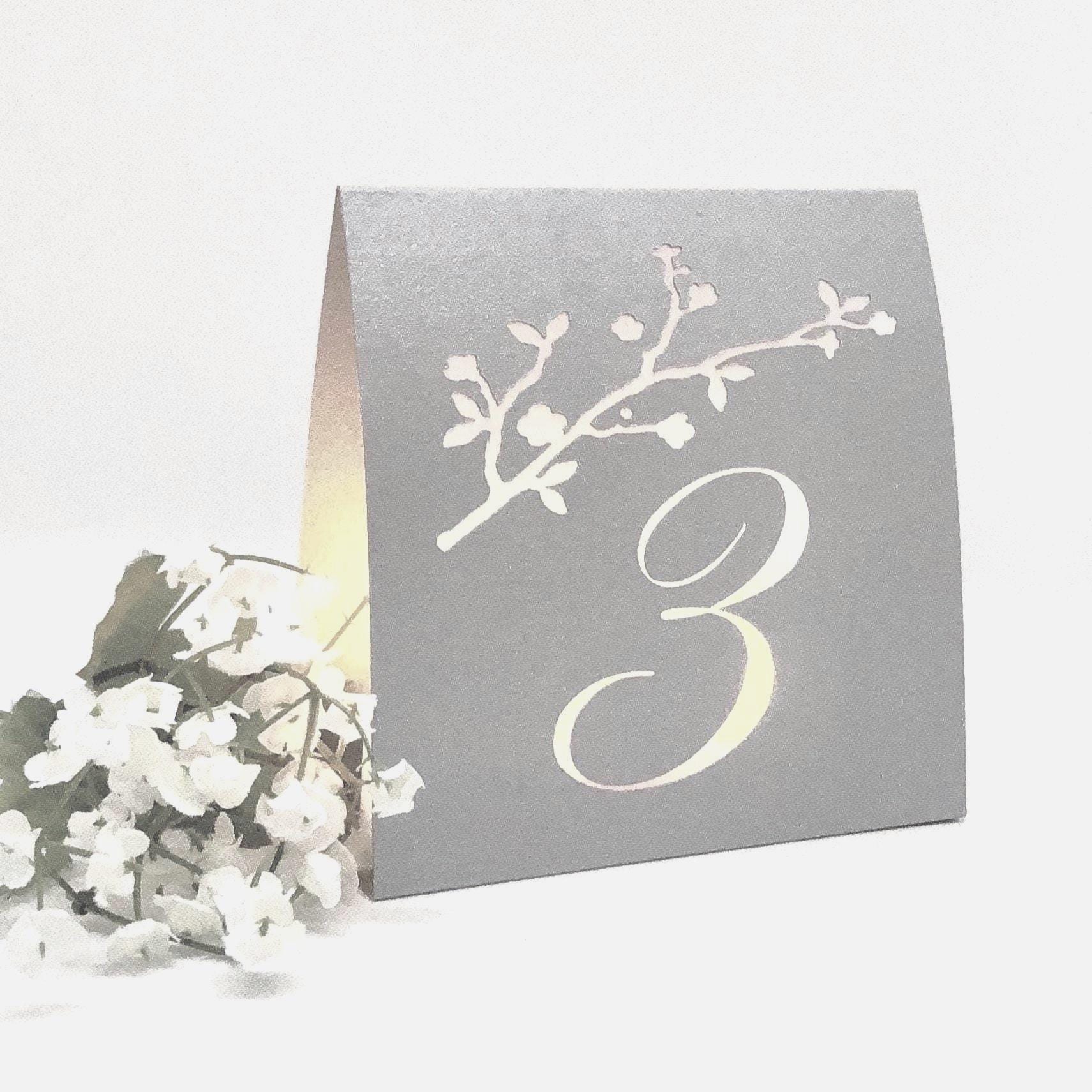 Blossom Branch Table Number Luminaries are made from card stock in your choice of White gold shimmer, Ivory Shine, Dove Gray shimmer, Light Purple (matte), Black (matte) or Rose Gold Mercury. The glow of the light through the cut out design brings romance to every table. Translucent vellum paper is attached inside (behind the cut-outs) so the design is like a window. They are designed to be used with LED candles (NOT included).