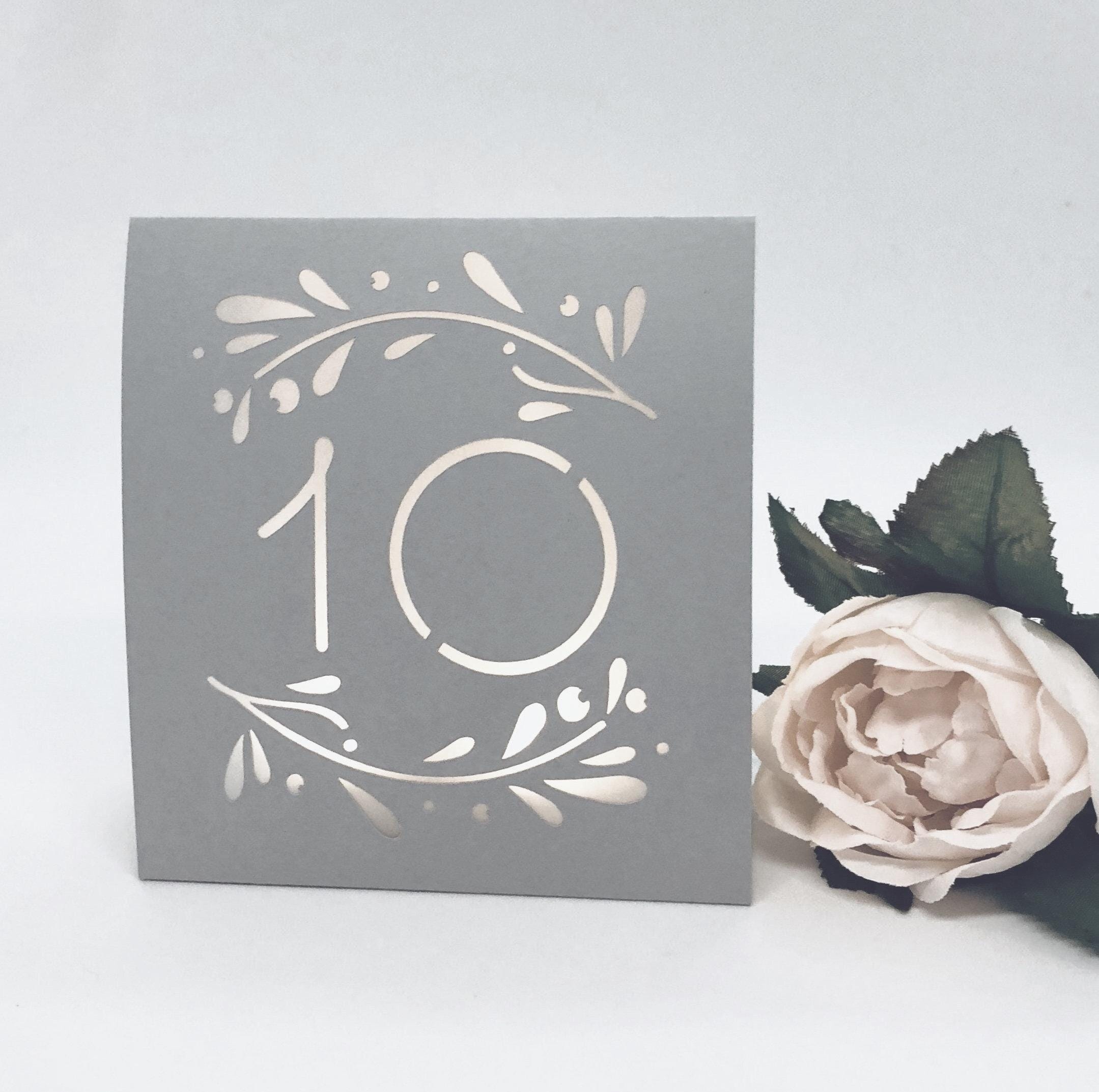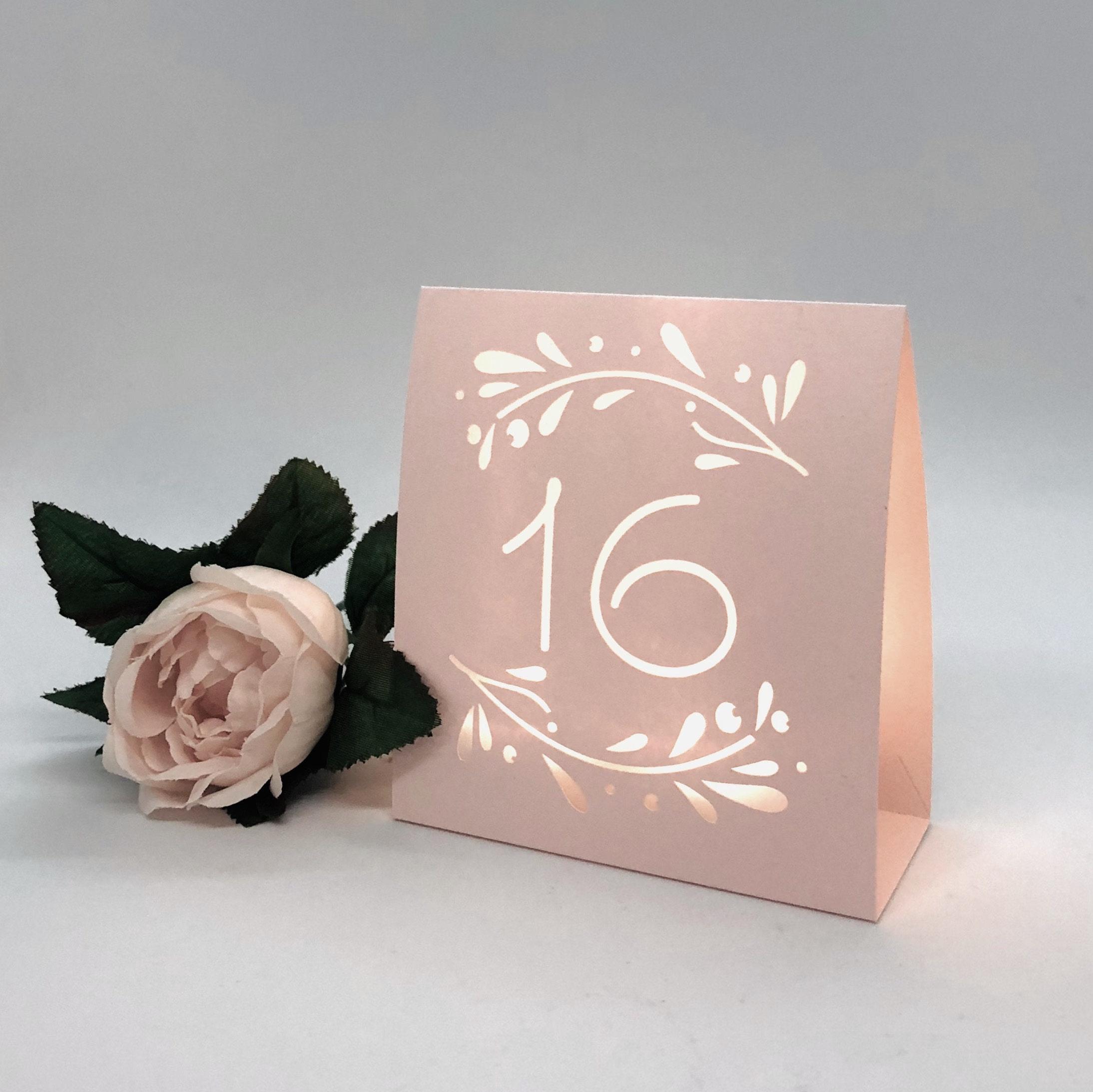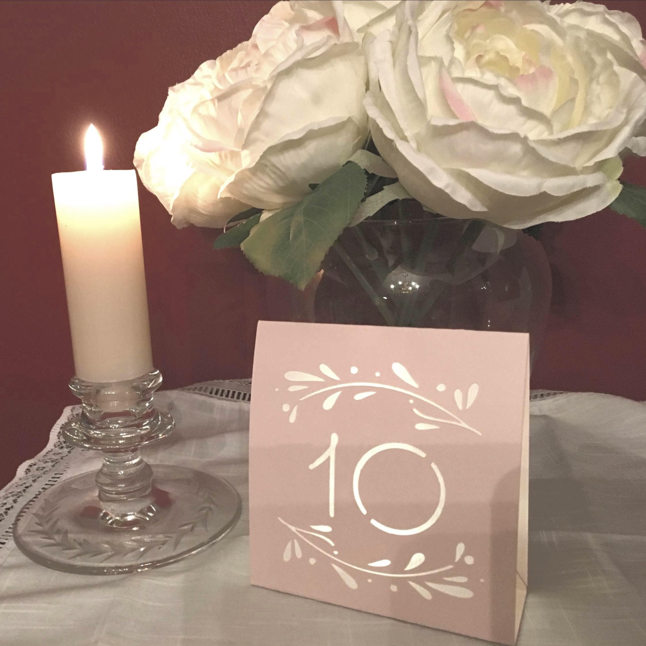 RUSTIC Vine Table Numbers for Weddings are made with Pink Blush or Gray card stock. Set the mood with these affordable table luminaries. The design and numbers are cut out allowing the battery tea lights to shine through! (Tea lights not included.) The front dimension is 4.5" tall and 4.2" wide.